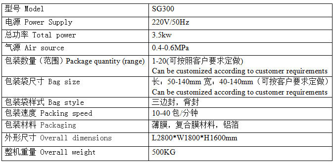 2. PLC control system is adopted for electric control, and Chinese man-machine interface is provided, so that the equipment is simple to operate, easy to adjust, and high in automation. It is suitable for single material packaging and mixed packaging of multiple materials.